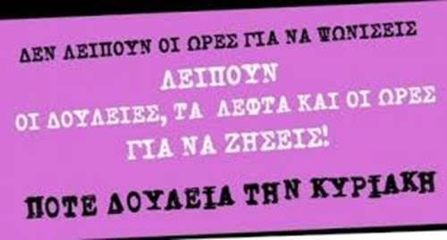 Μαζί με την πλήρη ανατροπή και τη γενικευμένη επιβολή ελαστικών μορφών απασχόλησης, με μισθούς φτώχειας, η κατάργηση της Κυριακής αργίας είναι το τελευταίο βήμα για την πλήρη κατάργηση των εργασιακών μας δικαιωμάτων, του δικαιώματός μας στην ανάπαυση και τον ελεύθερο χρόνο.