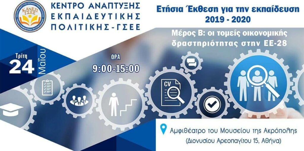 Το Κέντρο Ανάπτυξης Εκπαιδευτικής Πολιτικής της ΓΣΕΕ (ΚΑΝΕΠ-ΓΣΕΕ) πραγματοποιεί εκδήλωση με θέμα «ΕΚΠΑΙΔΕΥΣΗ ΚΑΙ ΑΠΑΣΧΟΛΗΣΗ: Μεγέθη, Τάσεις και Εξελίξεις», την Τρίτη 24 Μαΐου 2022 και ώρα 09:00 π.μ. στο Αμφιθέατρο του Μουσείου της Ακρόπολης (Διονυσίου Αρεοπαγίτου 15, Αθήνα), για την παρουσίαση της «Ετήσιας Έκθεσης για την Εκπαίδευση 2019-2020 | Μέρος Β: Οι τομείς οικονομικής δραστηριότητας […]