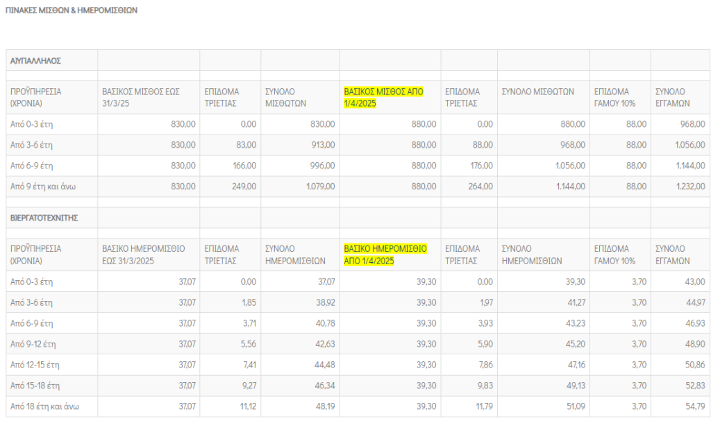 ΠΙΝΑΚΕΣ ΔΙΑΜΟΡΦΩΣΗΣ ΚΑΤΩΤΑΤΟΥ ΜΙΣΘΟΥ ΚΑΙ ΗΜΕΡΟΜΙΣΘΙΟΥ ΜΕ ΠΡΟΣΑΥΞΗΣΕΙΣ ΤΡΙΕΤΙΩΝ ΚΑΙ ΕΠΙΔΟΜΑΤΟΣ ΓΑΜΟΥ ΑΠΟ 1 ΑΠΡΙΛΙΟΥ 2025