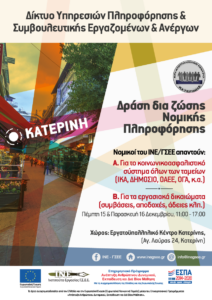 Το Εργατοϋπαλληλικό Κέντρο Κατερίνης σε συνεργασία με το Ινστιτούτο Εργασίας της Γ.Σ.Ε.Ε. διοργανώνουν την Τετάρτη 19 και την Πέμπτη 20 Νοεμβρίου 2025 και ώρα 12:00-18:00, δράση δια ζώσης νομικής πληροφόρησης σε θέματα εργατικού δικαίου και δικαίου κοινωνικοασφαλιστικού συστήματος.