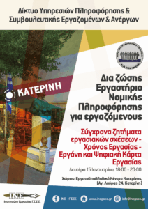 Το Εργατοϋπαλληλικό Κέντρο Κατερίνης σε συνεργασία με το Ινστιτούτο Εργασίας της Γ.Σ.Ε.Ε. διοργανώνουν την Τετάρτη 19 και την Πέμπτη 20 Νοεμβρίου 2025 και ώρα 12:00-18:00, δράση δια ζώσης νομικής πληροφόρησης σε θέματα εργατικού δικαίου και δικαίου κοινωνικοασφαλιστικού συστήματος.