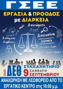 Το Εργατικό Κέντρο Κατερίνης καλεί όλους τους εργαζόμενους, τους συνταξιούχους, τους ανέργους της Πιερίας να πάρουν μέρος στο Συλλαλητήριο διαμαρτυρίας, το ΣΑΒΒΑΤΟ 7 Σεπτέμβρη 2024 στις 18.00 στο Άγαλμα του Βενιζέλου στη ΘΕΣΣΑΛΟΝΙΚΗ και στην πορεία διαμαρτυρίας που θα ακολουθήσει.