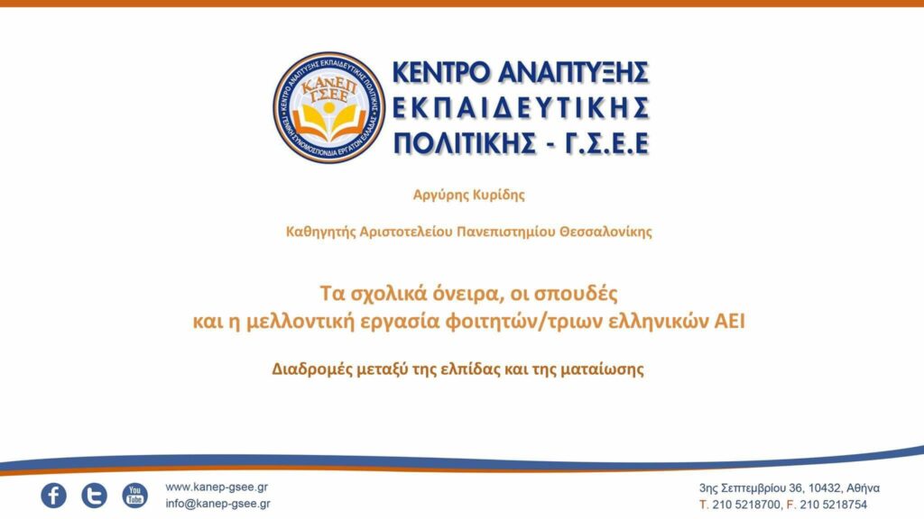 Το ΚΑΝΕΠ-ΓΣΕΕ, παρουσίασε διαδικτυακά την πρόσφατη έρευνά του με τίτλο: «Τα σχολικά όνειρα, οι σπουδές και η μελλοντική εργασία φοιτητών/-τριών ελληνικών ΑΕΙ: Διαδρομές μεταξύ της ελπίδας και της ματαίωσης», Επιστημονικός Υπεύθυνος της οποίας είναι ο Καθηγητής του Αριστοτελείου Πανεπιστημίου Θεσσαλονίκης, Αργύρης Κυρίδης. Η παρουσίαση της έρευνας εντάχθηκε στο πλαίσιο ευρύτερης εκδήλωσης υπό τη θεματική «Τριτοβάθμια […]