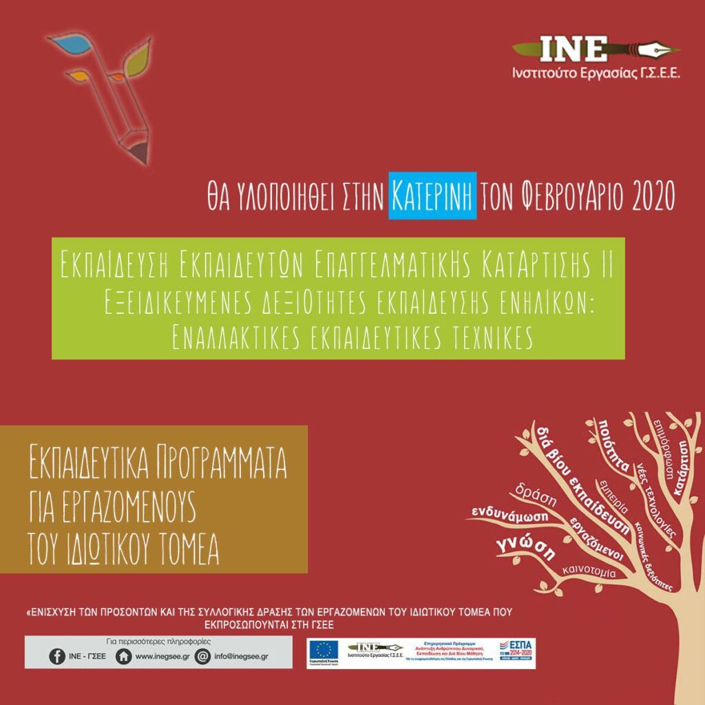 Ξεκινάει στην #Κατερίνη δωρεάν πρόγραμμα κατάρτισης εργαζομένων του ιδιωτικού τομέα με τίτλο: «Εκπαίδευση Εκπαιδευτών Επαγγελματικής Κατάρτισης ΙΙ: Εξειδικευμένες δεξιότητες εκπαίδευσης ενηλίκων: εναλλακτικές εκπαιδευτικές τεχνικές», διάρκειας 50 ωρών (30 ώρες δια ζώσης και 20 ώρες εξ αποστάσεως). Στο πλαίσιο αυτού του θεματικού αντικειμένου επεξεργαζόμαστε την έννοια της βιωματικής μεθοδολογίας εκπαίδευσης και τη σημασία που έχει στην […]