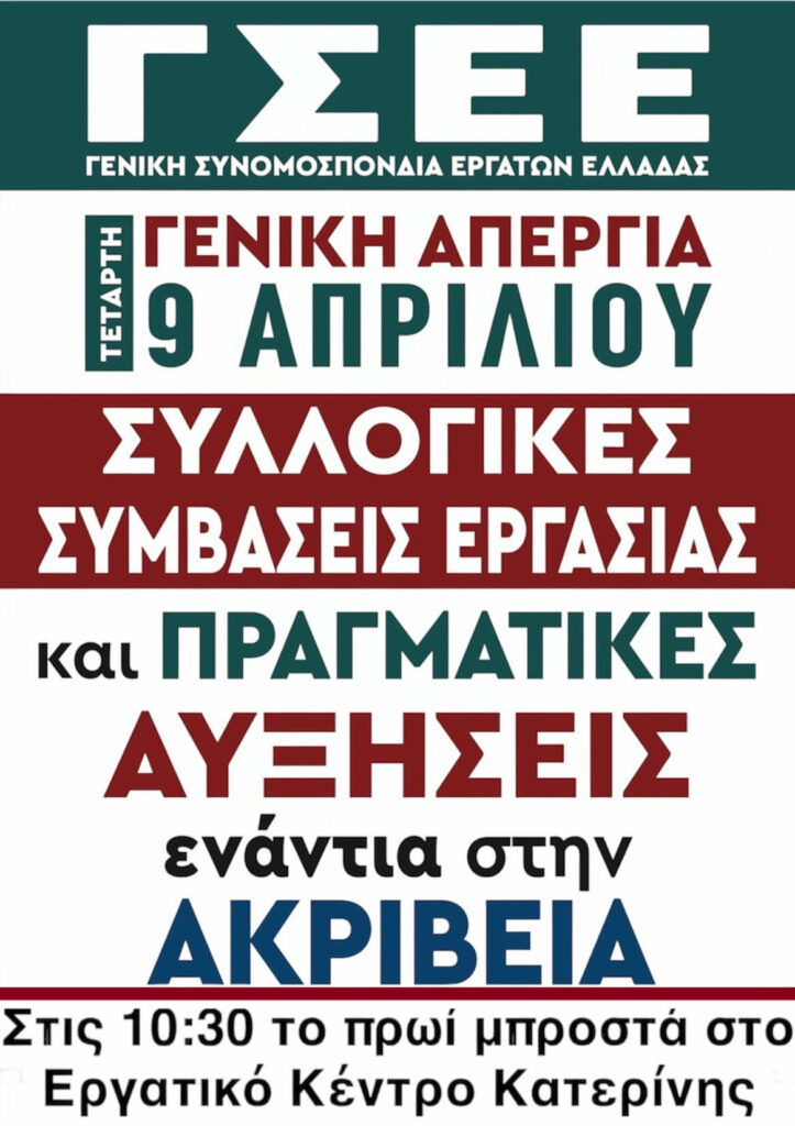 24ωρη Γενική Απεργία την Τετάρτη 9 Απριλίου 2025 και συγκέντρωση στο ΕΡΓΑΤΙΚΟ ΚΕΝΤΡΟ ΚΑΤΕΡΙΝΗΣ στις 10:30 το πρωί!