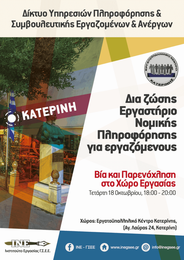 Το Εργατοϋπαλληλικό Κέντρο Κατερίνης σε συνεργασία με το Ινστιτούτο Εργασίας της Γ.Σ.Ε.Ε. διοργανώνουν την Πέμπτη 12 και την Παρασκευή 13 Ιουνίου και ώρα 12:00-18:00 , δράση δια ζώσης νομικής πληροφόρησης σε θέματα εργατικού δικαίου και δικαίου κοινωνικοασφαλιστικού συστήματος. Νομικοί συνεργάτες του ΙΝ.Ε./Γ.Σ.Ε.Ε. θα απαντούν σε εξατομικευμένα ερωτήματα και προβληματισμούς, σχετικά με: Α) το κοινωνικοασφαλιστικό σύστημα […]