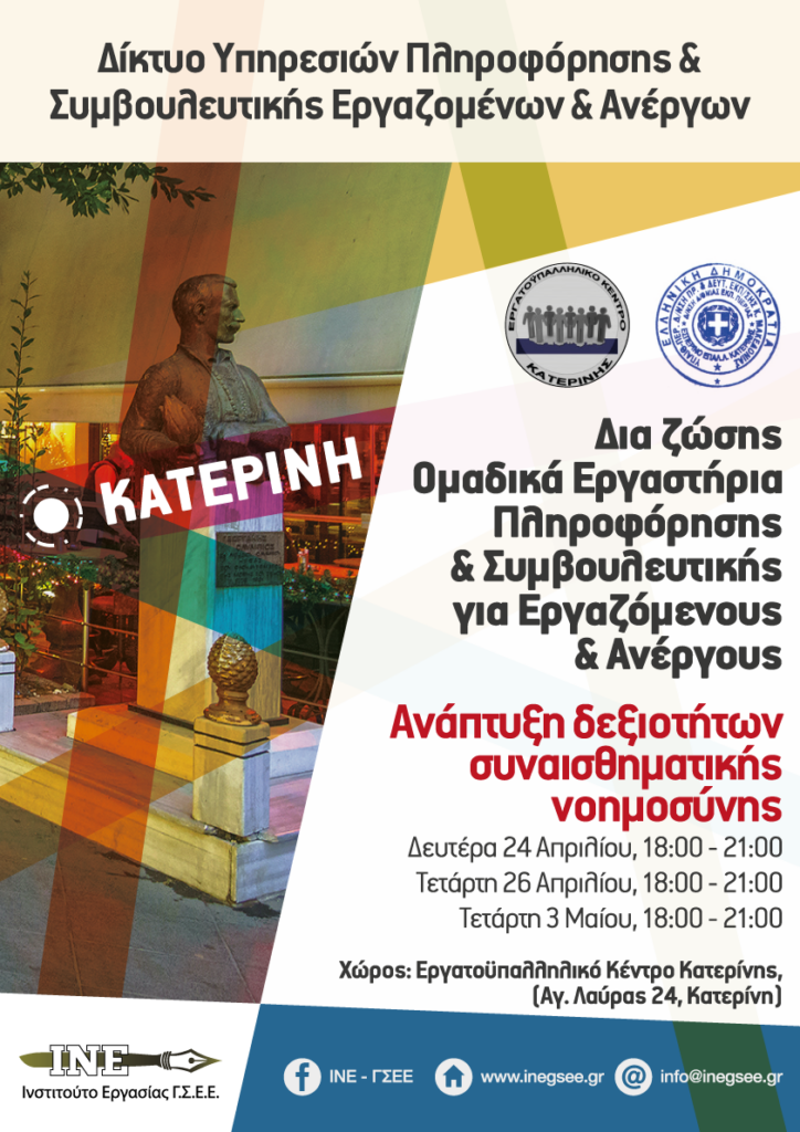 Το Εργατοϋπαλληλικό Κέντρο Κατερίνης και το Εσπερινό ΕΠΑΛ Κατερίνης σε συνεργασία με το Ινστιτούτο Εργασίας της Γ.Σ.Ε.Ε. διοργανώνουν την Δευτέρα 24 Απριλίου, την Τετάρτη 26 Απριλίου & την Τετάρτη 3 Μαϊου 2023 και ώρα 18:00-21:00 ομαδικά εργαστήρια επαγγελματικής πληροφόρησης και συμβουλευτικής με θέμα «Ανάπτυξη δεξιοτήτων συναισθηματικής νοημοσύνης». Τα εργαστήρια απευθύνονται σε εργαζόμενους και ανέργους κατόπιν […]