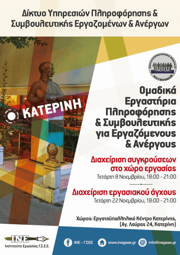 Το Εργατοϋπαλληλικό Κέντρο Κατερίνης σε συνεργασία με το Ινστιτούτο Εργασίας της Γ.Σ.Ε.Ε. διοργανώνουν την Τετάρτη στις 8 Νοεμβρίου 2023 και στις 22 Νοεμβρίου 202, ώρα 18:00-21:00 ομαδικά εργαστήρια συμβουλευτικής με θέμα «Διαχείριση συγκρούσεων στο χώρο εργασίας» & «Διαχείριση εργασιακού άγχους». Τα εργαστήρια απευθύνονται σε εργαζόμενους και ανέργους κατόπιν δήλωσης συμμετοχής και θα πραγματοποιηθούν στο Εργατοϋπαλληλικό Κέντρο […]