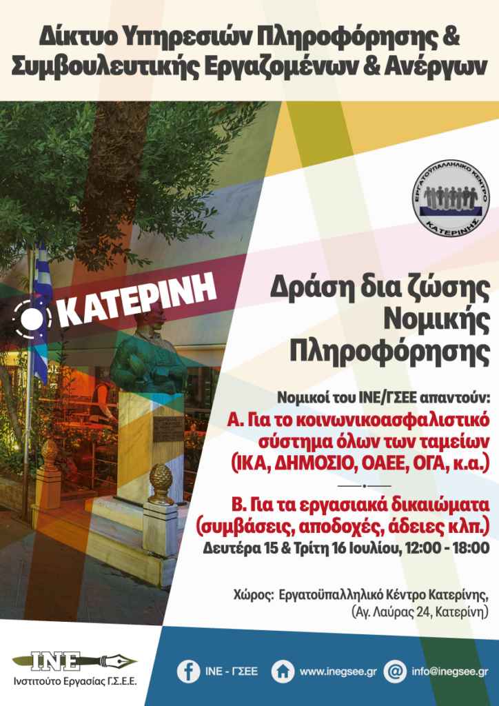 Το Εργατοϋπαλληλικό Κέντρο Κατερίνης σε συνεργασία με το Ινστιτούτο Εργασίας της Γ.Σ.Ε.Ε. διοργανώνουν τη Δευτέρα 15 και την Τρίτη 16 Ιουλίου 2024 και ώρα 12:00-18:00 , δράση δια ζώσης νομικής πληροφόρησης σε θέματα εργατικού δικαίου και δικαίου κοινωνικοασφαλιστικού συστήματος. Νομικοί συνεργάτες του ΙΝ.Ε./Γ.Σ.Ε.Ε. θα απαντούν σε εξατομικευμένα ερωτήματα και προβληματισμούς, σχετικά με: Α) το κοινωνικοασφαλιστικό […]